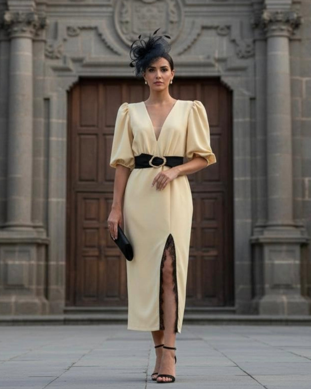 Vestido midi confeccionado en tejido de crepe de alta calidad que ofrece elegancia y comodidad. Destaca por su escote en pico que favorece la silueta, complementado con mangas abullonadas ajustables mediante elástico en los puños para un agarre seguro. Cinturón integrado con hebilla dorada que define la cintura. La falda presenta una raja lateral adornada con encaje delicado, aportando movimiento y sofisticación. Forro interior completo y cremallera invisible en la espalda para facilitar el vestido. Prenda versátil ideal para ocasiones especiales.