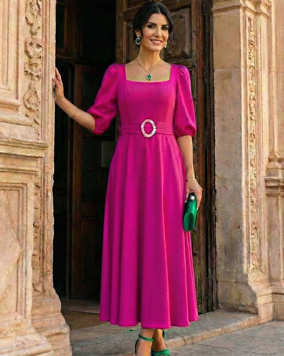 Vestido de diseño refinado confeccionado en piana, un tejido noble que ofrece una caída impecable y suavidad excepcional. Destaca por su escote cuadrado que favorece la figura y mangas abullonadas que aportan elegancia y movimiento. Complementado con cinturón de hebilla dorada que acentúa la cintura, y falda en capas que genera volumen y dinamismo. La calidad del tejido garantiza comodidad y una presencia sofisticada, ideal para eventos y ocasiones que requieren distinción.