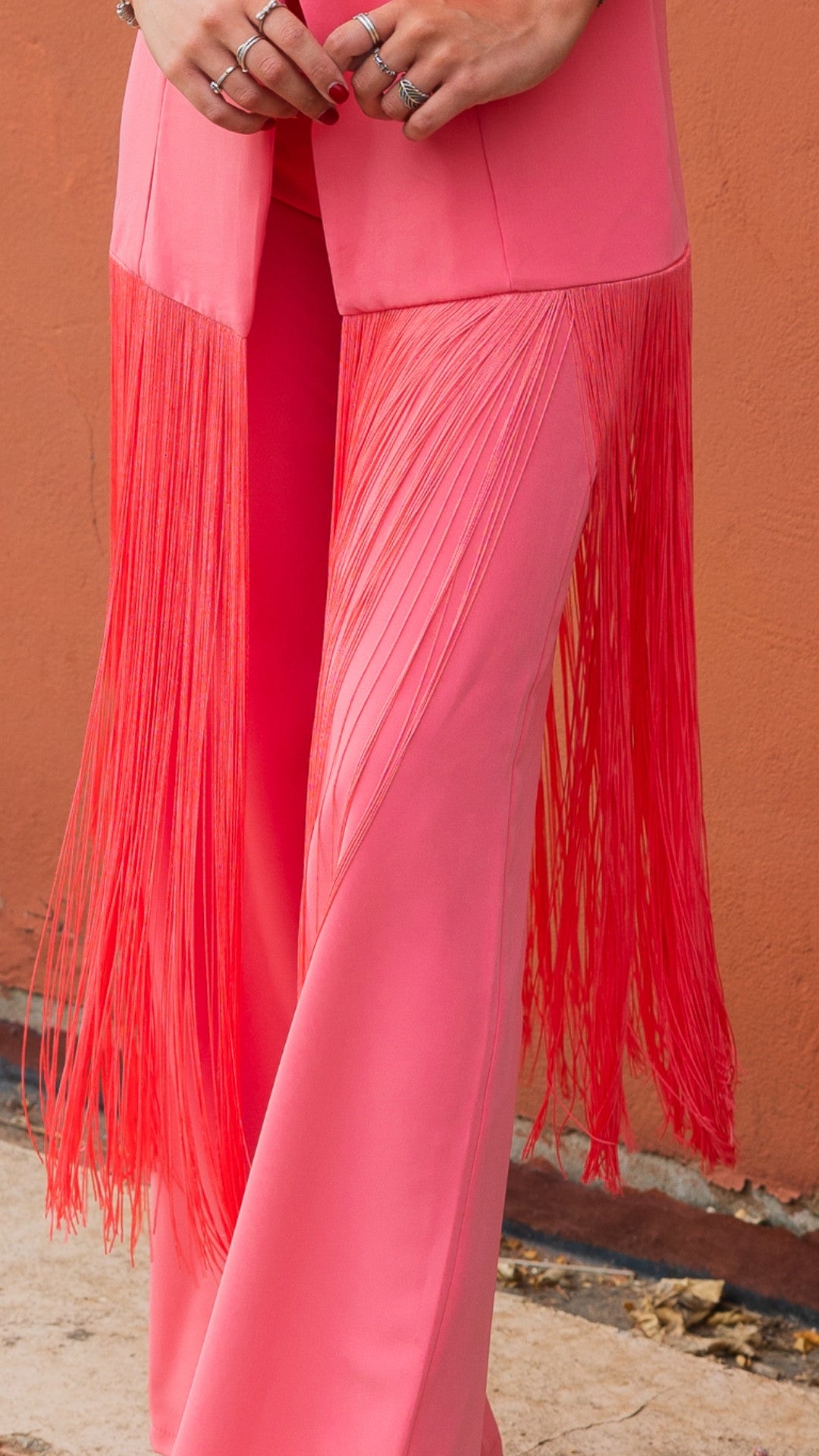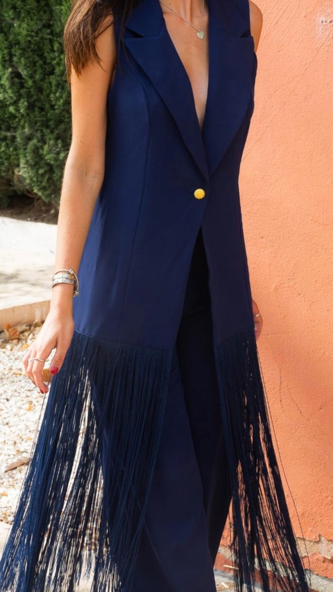 Conjunto elegante de dos piezas confeccionado en crepe de alta calidad. La chaqueta destaca por sus solapas clásicas y botonadura dorada que aporta un toque sofisticado. Su corte con caída estratégica disimula la silueta y se complementa con un detalle de fleco que añade movimiento y estilo. El pantalón acampanado cuenta con cremallera lateral, creando una línea moderna y favorecedora. Perfecto para ocasiones especiales o para elevar tu look diario con elegancia.